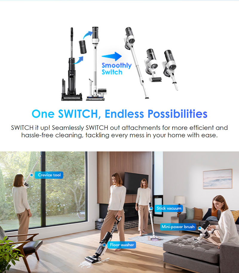 • Switch seamlessly between a floor washer, stick vacuum, or handheld vacuum